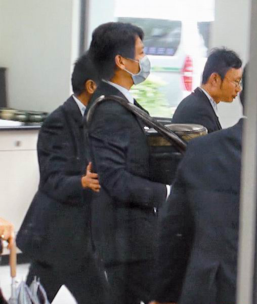 陶喆(中)神情肅穆,捧著父親陶大偉的骨灰快步離去。(圖片來自臺媒)