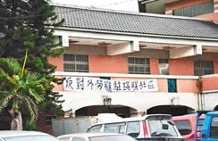 桃園縣八德市瑞聯(lián)社區(qū)反對外勞進駐,在社區(qū)外面貼上抗議布條表達立場。圖片來源:臺灣《中國時報》