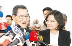 前臺灣當局副領導人蕭萬長(左)19日受邀前往小英基金會演講,受到前民進黨主席蔡英文(右)歡迎。圖片來源:臺灣《中國時報》