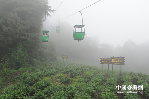 離開名山茶馬司遺址,兩岸記者乘坐纜車奔向蒙頂山。這里獨特的氣候,為優(yōu)質(zhì)茶葉的生長提供了澹的條件。放眼望去,煙霧繚繞中是片片茶田。(四川省臺辦供圖)