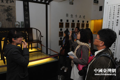 圖為兩岸記者參訪蒙頂山世界茶文化博物館,聽導(dǎo)游講解茶葉的知識(shí)、茶的歷史及茶文化藝術(shù)等。(四川省臺(tái)辦供圖)