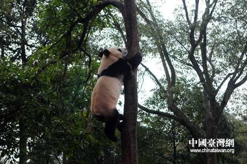 大熊貓爬上樹梢(中國臺灣網(wǎng) 王曉蕊 攝)