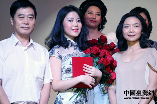 八寶山街道辦事處主任與評委馮小寧為季軍杜佳瑤頒獎。(中國臺灣網(wǎng) 吳怡 攝)