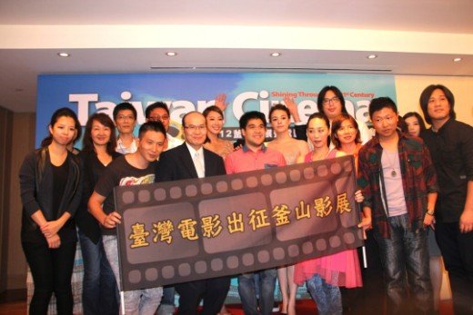 各劇組人員一同舉旗,宣示“臺灣電影出征釜山影展”。(圖片來自臺灣“今日新聞網(wǎng)”)