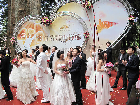 中國(guó)臺(tái)灣網(wǎng)10月12日消息 據(jù)臺(tái)灣“今日新聞網(wǎng)”報(bào)道,為推廣臺(tái)灣訂婚主題游程,臺(tái)當(dāng)局“交通部觀光局”籌劃的“旅行臺(tái)灣,就是現(xiàn)在”浪漫系列活動(dòng),于今日推出“2012阿里山新印象—神木下婚禮山海戀”,此次將有13對(duì)新人在阿里山千年神木的見(jiàn)證下互許神圣的誓言,完成終身大事,其中有3對(duì)新人是來(lái)自山東和江蘇的佳偶。