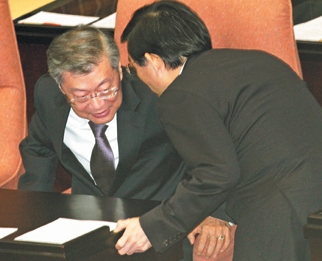 針對疾管局副局長施文儀在網(wǎng)絡(luò)發(fā)表意見,陳沖(左)昨天表示已請臺當(dāng)局人事主管部門負(fù)責(zé)人黃富源(右)調(diào)查是否違反公務(wù)員服務(wù)條例。圖為黃富源在向陳沖報告。圖片來源:臺灣《聯(lián)合報》