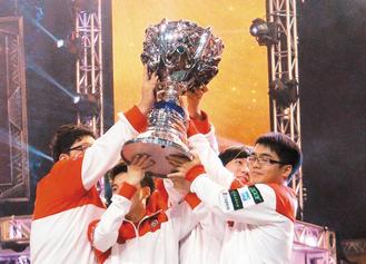 電玩英雄聯(lián)盟第二季世界錦標(biāo)賽,臺(tái)灣代表隊(duì)“臺(tái)北暗殺星”擊敗韓國對(duì)手,贏得冠軍,全體隊(duì)員在頒獎(jiǎng)典禮上高舉獎(jiǎng)杯。圖片來源:臺(tái)灣《聯(lián)合報(bào)》