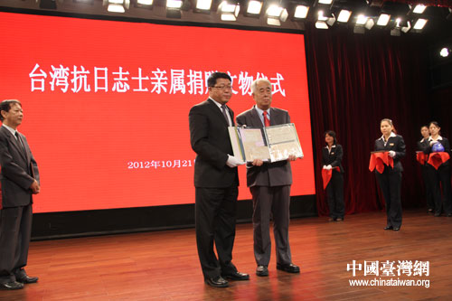 中國臺灣網(wǎng)10月21日北京消息 2012年10月21日上午,為紀(jì)念中國人民抗日戰(zhàn)爭勝利67周年、臺灣光復(fù)67周年,臺盟中央、全國臺聯(lián)及北京市臺盟、臺聯(lián),中國人民抗日戰(zhàn)爭紀(jì)念館、臺灣抗日志士親屬協(xié)進會,共同在中國人民抗日戰(zhàn)爭紀(jì)念館舉行臺灣抗日志士親屬捐贈文物儀式。