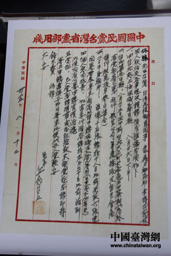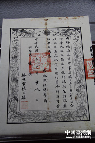 閩南軍司令林祖密恢復(fù)中國國籍證明復(fù)制件。(中國臺灣網(wǎng) 楊麗 攝)