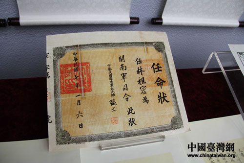 閩南軍司令林祖密的任命狀復(fù)制件。(中國臺灣網(wǎng) 楊麗 攝)