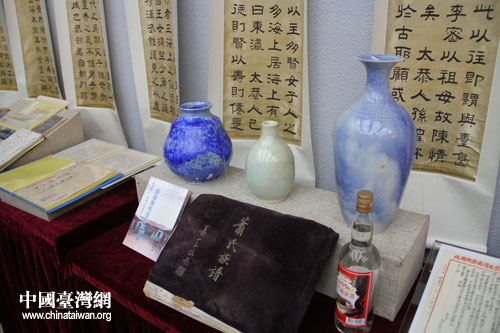 蕭道應(yīng)燒制的、贈給王曉波教授意喻祖國統(tǒng)一的花瓶以及蕭氏族譜。(中國臺灣網(wǎng) 楊麗 攝)