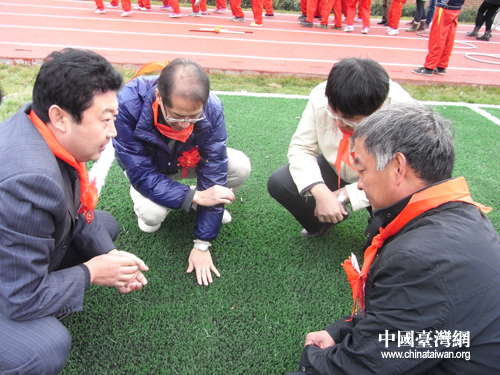 頂新公益基金會理事長騰鴻年與鄉(xiāng)鎮(zhèn)負責人及小學校長一起查看人造草坪足球場質量(中國臺灣網(wǎng)記者 蕪同攝)