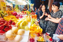 臺(tái)灣水果質(zhì)量佳,是不少觀(guān)光客赴臺(tái)必吃美味,圖為兩名大陸游客在攤位前試吃,頻頻稱(chēng)贊臺(tái)灣水果好甜。圖片來(lái)源:臺(tái)灣《中國(guó)時(shí)報(bào)》