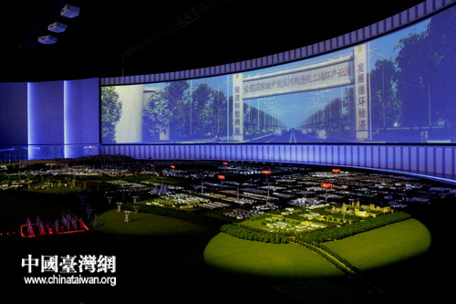 10月23日,“感知甘肅”第四屆網(wǎng)絡(luò)媒體采訪團(tuán)參觀考察金昌市循環(huán)經(jīng)濟(jì)發(fā)展?fàn)顩r。 圖為金昌市循環(huán)經(jīng)濟(jì)展覽館內(nèi)弧形環(huán)幕播放的金昌市宣傳片。 (中國(guó)臺(tái)灣網(wǎng) 董憲超 攝)