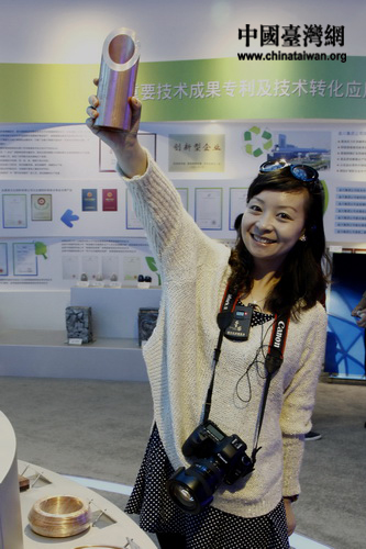 10月23日,“感知甘肅”第四屆網(wǎng)絡(luò)媒體采訪團(tuán)參觀考察金昌市循環(huán)經(jīng)濟(jì)發(fā)展?fàn)顩r。 圖為記者手舉循環(huán)經(jīng)濟(jì)成果展示臺樣品。 (中國臺灣網(wǎng) 董憲超 攝)