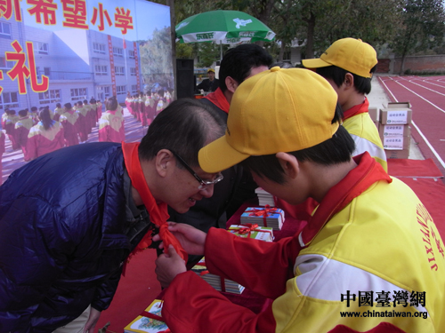 在新落成的運(yùn)動(dòng)場(chǎng)上,學(xué)校的小朋友為頂新公益基金會(huì)理事長騰鴻年戴上了紅領(lǐng)巾(中國臺(tái)灣網(wǎng)記者 蕪?fù)瑪z)