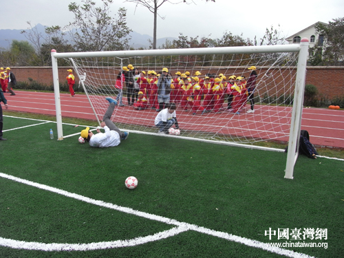 這個(gè)頂新的大哥哥吹牛說自己守門是鐵門,“鐵門”大哥哥在小朋友們的八方進(jìn)攻下,終于在撲救一個(gè)刁鉆射門時(shí),摔了個(gè)四腳朝天,逗的小朋友們哈哈大笑(中國臺(tái)灣網(wǎng)記者 蕪?fù)瑪z)