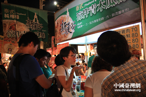 大陸大學(xué)生在臺灣學(xué)生邀請下在臺南大東夜市品嘗美食(中國臺灣網(wǎng) 王文英 攝)