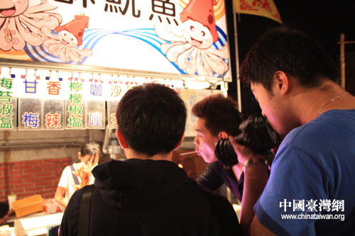 中國臺灣網(wǎng)10月26日臺北消息 10月23日晚上,在臺灣大學(xué)生的熱情邀請下,參加2012年大陸青年志愿者赴臺交流團的大陸學(xué)生們在臺南府城初次體驗了臺灣最具特色的民間文化——夜市。這里夜市面積不大,但小攤林立,人群匯集,庶民意味十分濃厚,是臺灣民眾最鐘情的場所,也是大陸游客體驗臺灣平民文化的極佳地帶。