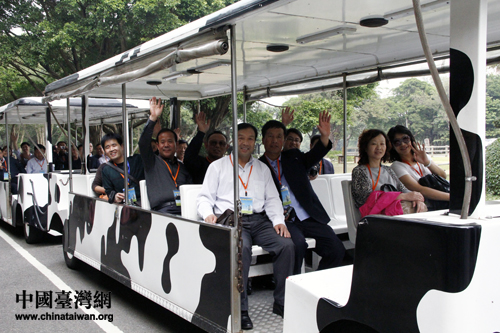 大陸基層農(nóng)民代表參訪桃園味全埔心牧場,乘坐牧場特色游覽車。 (中國臺灣網(wǎng) 于斯文 攝)