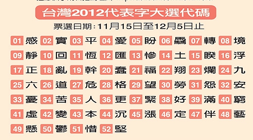 中國臺灣網(wǎng)11月15日消息 據(jù)臺灣《聯(lián)合報》報道, “臺灣2012代表字大選”今天(15日)起跑。今年邁入第五屆,邀請65位各行各業(yè)的名人與達人,推薦52個代表字供讀者票選。12月5日票選截止。