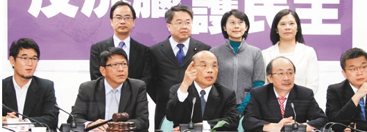 民進(jìn)黨主席蘇貞昌(前排中)昨天率臺(tái)“立法院”黨團(tuán)三長(zhǎng)等人,公開(kāi)重申反對(duì)臺(tái)灣旺中并購(gòu)壹傳媒案,并呼吁馬英九對(duì)并購(gòu)案表態(tài)。圖片來(lái)源:臺(tái)灣《聯(lián)合報(bào)》