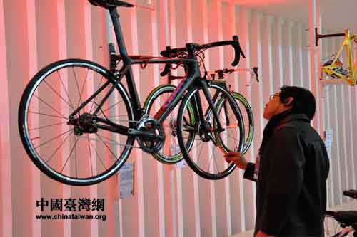 訪客對展架上的自行車投去好奇目光。(中國臺灣網(wǎng) 發(fā))