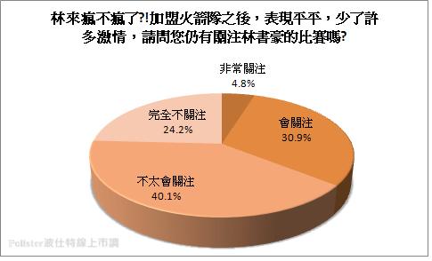 調(diào)查結果顯示,非常關注4.8%和會關注30.9%,兩者合計35.7%,雖不在少數(shù),但還是低于不太會關注40.1%和完全不關注24.2%合計的64.3%。相較在2012年初林書豪表現(xiàn)高檔時,電視媒體每天放送最新消息,甚至還有專題報道,而現(xiàn)在只有在有比賽時顯示比分數(shù)和最新戰(zhàn)況。相較于年初做的調(diào)查,當時有近半數(shù)(46.5%)的民眾會因為林書豪而增加對NBA的關注,民眾對林書豪的熱度似乎也略微下滑。