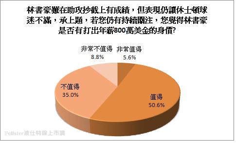 林書豪不只是臺灣在關注,在休斯頓也有成千上萬的眼睛在看著他每場的表現(xiàn)。年薪百萬美金的林書豪,有50.6%的民眾認為他值這個價錢,非常值得占5.6%,反之不值得和非常不值得合計有43.8%。以值得就過半數(shù)來看,民眾對林書豪還是很有信心的。