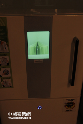 一鍵式書籍除菌機(jī)擺放在自助借還書機(jī)旁邊,只需將書籍放入,30秒便可完成紫外線除菌。(中國臺灣網(wǎng) 馬迪 攝)