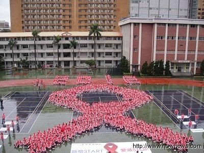 宣導(dǎo)青少年艾滋病預(yù)防,臺北市開南高級商工職業(yè)學(xué)校1706位學(xué)生30日冒雨排出象征關(guān)懷艾滋病的紅絲帶。(圖片來自臺灣“今日新聞網(wǎng)”)