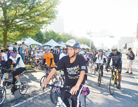 臺南市市長賴清德、議員李文正等人為活動鳴笛。賴清德說,市府正打造沿著嘉南大圳到烏山頭水庫的山海自行車道,全長45公里,將使臺南成為最佳單車運(yùn)動城市。