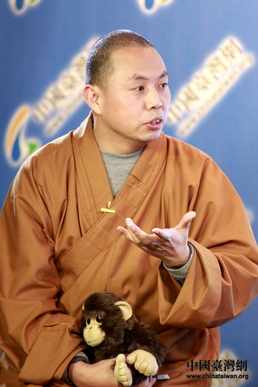 延參法師“天然萌” ,對(duì)毛絨小猴愛(ài)不釋手。(中國(guó)臺(tái)灣網(wǎng) 王偉 攝)