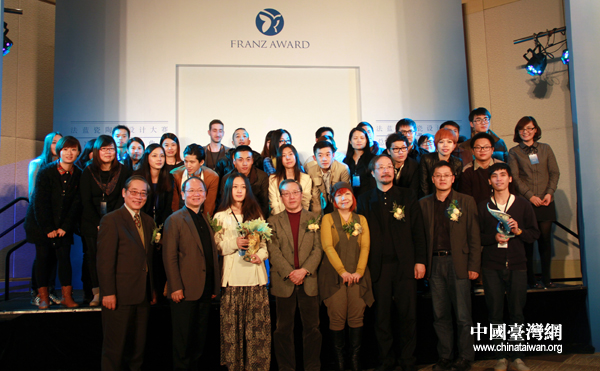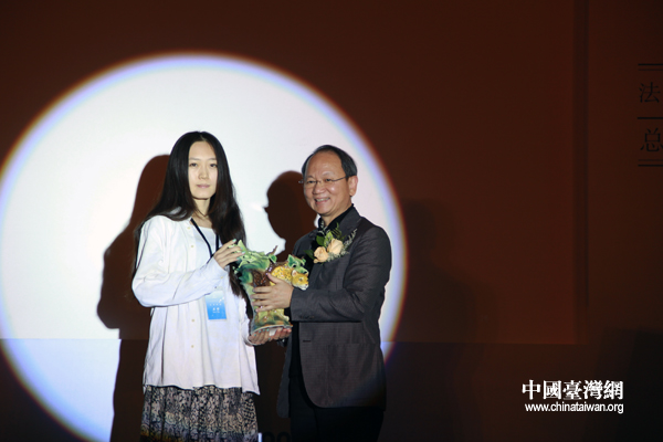 清華大學(xué)大四女生武超獲得金獎(jiǎng),圖為法藍(lán)瓷有限公司總裁陳立恒為其頒獎(jiǎng)(中國臺(tái)灣網(wǎng) 李徽 攝)