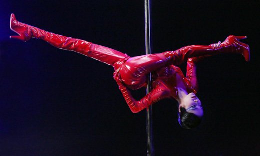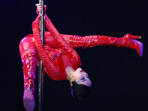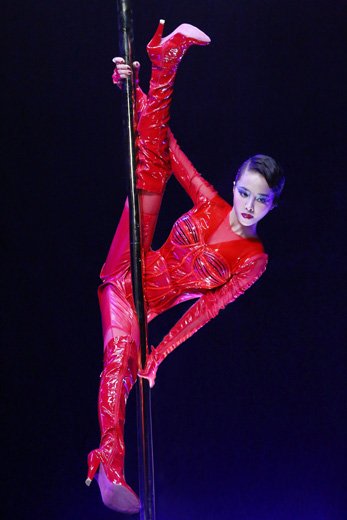 蔡依林表演高難度“自轉(zhuǎn)鋼管”。(來(lái)源:華納唱片)