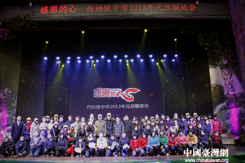 在西柏坡中學(xué)“感恩的心——元旦聯(lián)歡會”結(jié)束后,頂新基金會理事長騰鴻年在有關(guān)領(lǐng)導(dǎo)陪同下上臺與演員合影(中國臺灣網(wǎng)記者 蕪?fù)?攝)