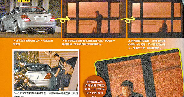 去年10月姚元浩稱與王心凌幾乎沒有聯(lián)絡(luò),王心凌在圣誕節(jié)前夕為演唱會定裝時(shí)也稱與姚元浩已沒聯(lián)絡(luò)。但昨出刊的《壹周刊》卻爆料去年12月14日拍到姚元浩自由進(jìn)出王家,跨年當(dāng)天更拍到他將銀色奔馳直接開進(jìn)可看臺北101煙火的王家,與友人在王家開趴,2人還趁著等煙火空檔,走到窗邊看夜景,姚從后面環(huán)抱她、她則把頭靠在他的胸膛。
