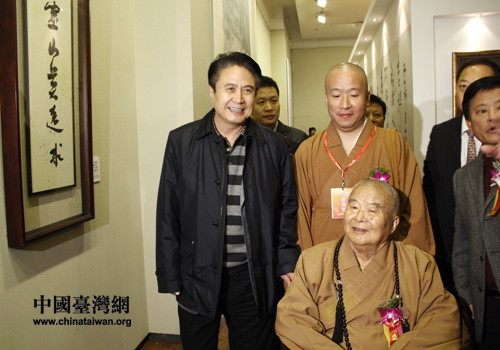 海南省委書(shū)記、省人大常委會(huì)主任羅保銘陪同星云大師細(xì)細(xì)參觀了一筆字書(shū)法展。(中國(guó)臺(tái)灣網(wǎng) 馬萌攝)