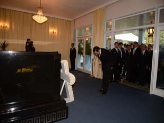 馬英九上午前往大溪頭寮,出席蔣經(jīng)國逝世25周年謁陵,桃園縣長吳志揚(yáng)等人陪同。隨后向蔣經(jīng)國陵墓獻(xiàn)花、行三鞠躬,神情嚴(yán)肅。馬英九并進(jìn)入陵寢長思,向當(dāng)年對他有知遇之恩的老長官表達(dá)無限的追思。