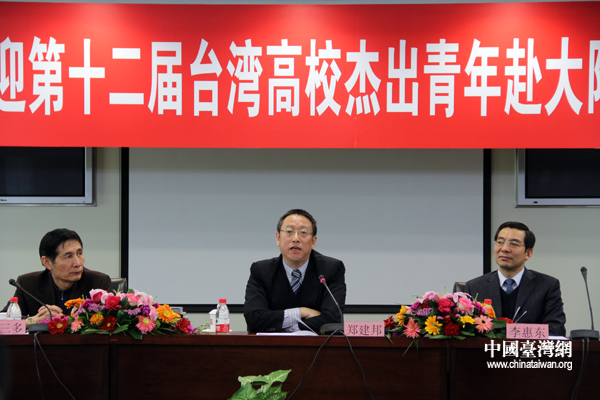 鄭建邦在會(huì)見中對參訪團(tuán)的到來表示了歡迎,他說,剛剛過去的2012年,在兩岸關(guān)系發(fā)展進(jìn)程上具有特殊重要的意義。年初臺灣地區(qū)兩項(xiàng)重要選舉結(jié)果表明,兩岸關(guān)系和平發(fā)展符合兩岸同胞的共同愿望,符合中華民族的整體利益,符合時(shí)代發(fā)展進(jìn)步的潮流。只要兩岸雙方沿著和平發(fā)展的正確道路堅(jiān)定走下去,就一定能進(jìn)一步開創(chuàng)兩岸關(guān)系和平發(fā)展的新局面,也勢必給兩岸的青年才俊提供更為寬闊的展示才華的舞臺。