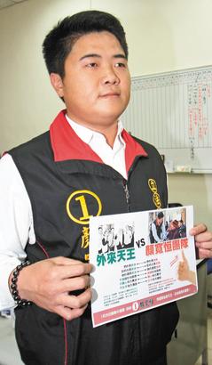 顏寬恒拿著文宣表示,希望民進(jìn)黨外來的天王們不要打他們父子。圖自臺灣《聯(lián)合報(bào)》