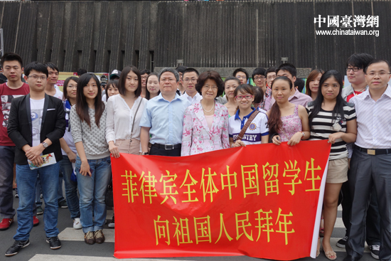 中國(guó)駐菲律賓大使館馬克卿大使、潘峰參贊和海峽兩岸留學(xué)生在一起(圖片來(lái)源:中國(guó)臺(tái)灣網(wǎng))