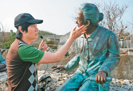 潘安邦2008年觸景傷情,輕撫外婆雕像臉頰。 圖片來(lái)自《聯(lián)合報(bào)》