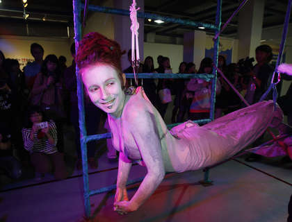 Alice Newstead表演背部肌肉被兩支鐵鉤穿過后懸空吊起。圖片來自臺(tái)灣媒體