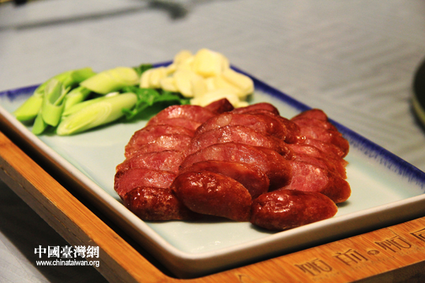香腸臘腸是臺灣美食中的精粹之一。大師傅用腸衣自灌,出品的香腸軟硬適中,色澤紅潤,入口飄香。特別值得一提的是,這香腸要配上青蒜一起享用,才能吃出地道的臺灣味道。