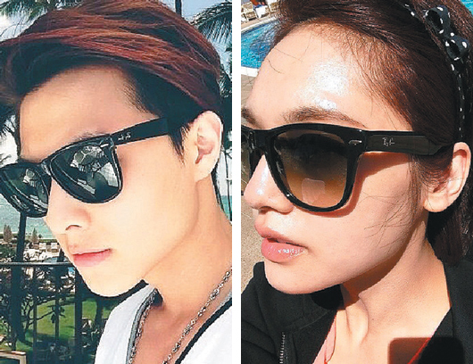 楊丞琳(右)與王子(左)分別在個人微博上傳戴太陽鏡照片,眼尖網(wǎng)友發(fā)現(xiàn),兩人竟是戴同款式的情侶眼鏡。(截取自楊丞琳、王子微博)