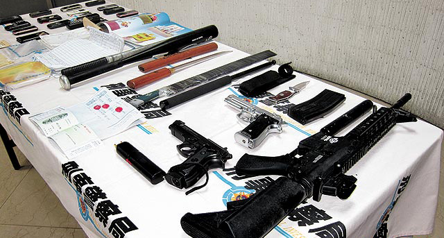 警方昨查扣開山刀、電擊棒、空氣槍及借據(jù)等證物。(圖片來自臺媒)