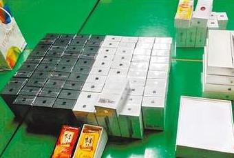 林嫌將飲料和白紙裝入iPhone、iPad空盒內(nèi),包膜后從外觀難辨真假。(圖片來自臺媒)