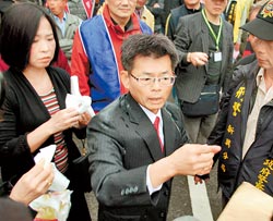 臺(tái)當(dāng)局“行政院南部服務(wù)中心主任”楊秋興遭蛋襲。(來(lái)源:臺(tái)灣《中國(guó)時(shí)報(bào)》)