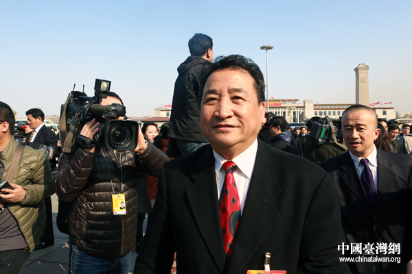 開(kāi)幕會(huì)舉行前,政協(xié)委員鞏漢林在人民大會(huì)堂前遭遇各路記者圍追堵截。(中國(guó)臺(tái)灣網(wǎng) 于斯文 攝)
